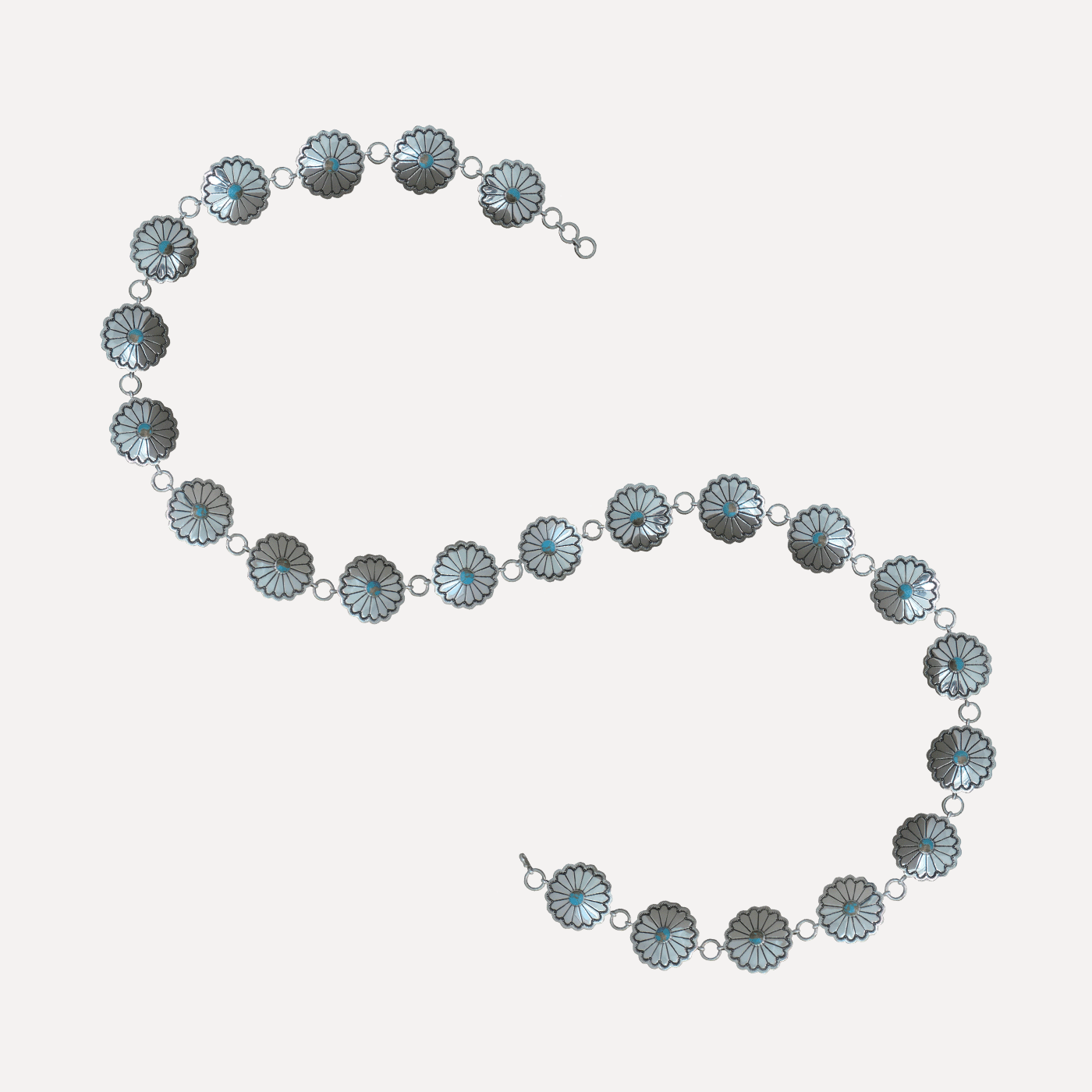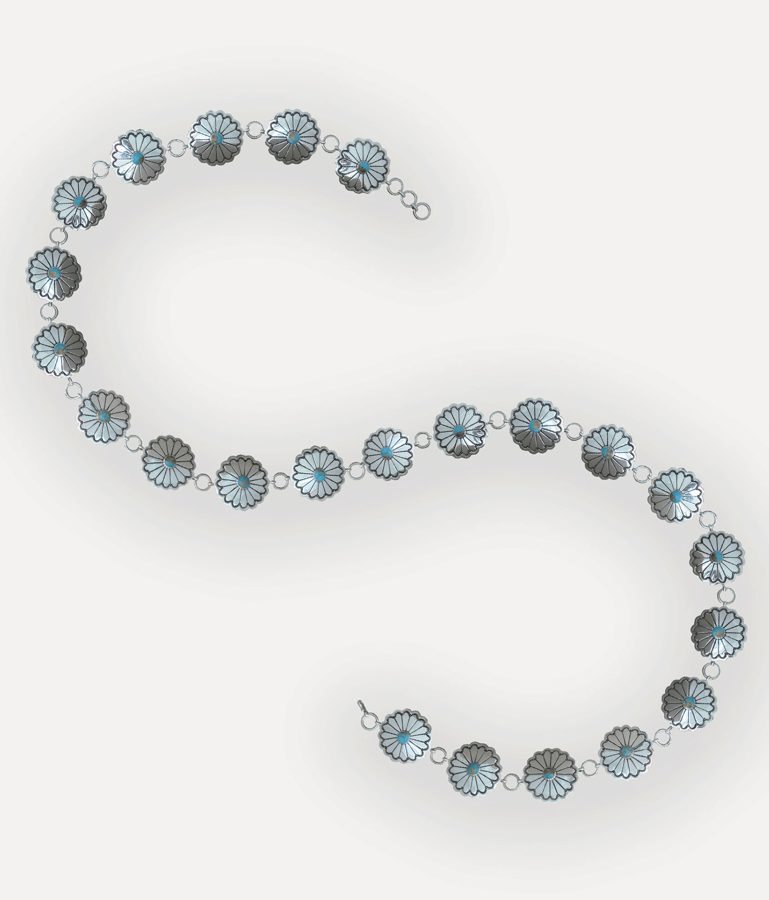 Our concho belts are sculptural statements forged in Navajoland by renowned Diné artisan. A physical dialogue with the artisan, a testament to a lineage of sacred craft. The Sundance offers a fluid succession of 23 scalloped conchos, their liquid brilliance centered by your choice of personal talisman—from Spiny Oyster to Italian Red Coral. The Wildfire counters with a formidable link of thick-gauged silver, its deeply struck ancestral stamps.