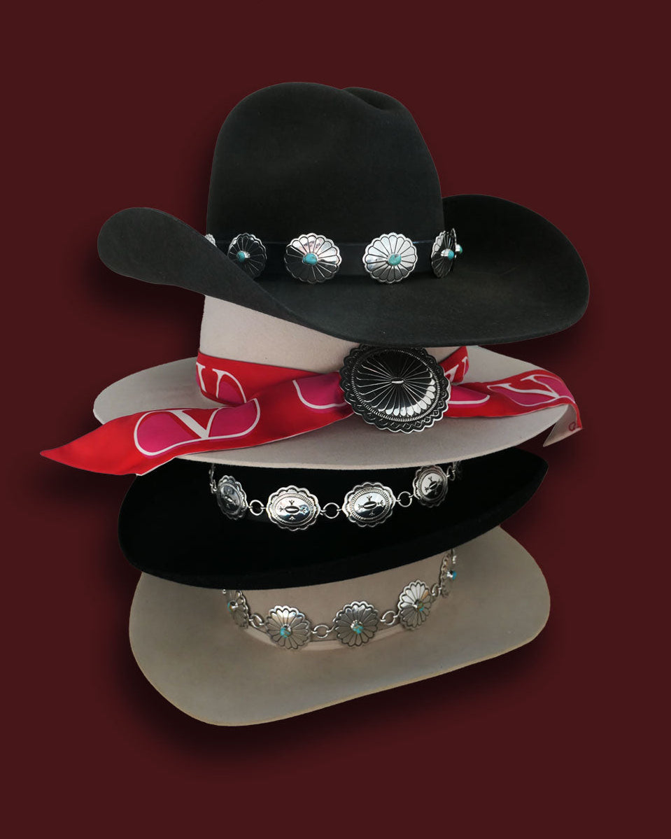 We believe an heirloom is not an object, but a narrative forged by hands that honor a timeless legacy. Our hat bands are a reverent homage to the sacred silversmith artistry of the Diné, transforming a simple cowboy hat from an object into a personal emblem. Whether it's the hand-stamped Texas Flood concho link inspired by SRV, or the more personalized Nizhóní with limitless stone selections.